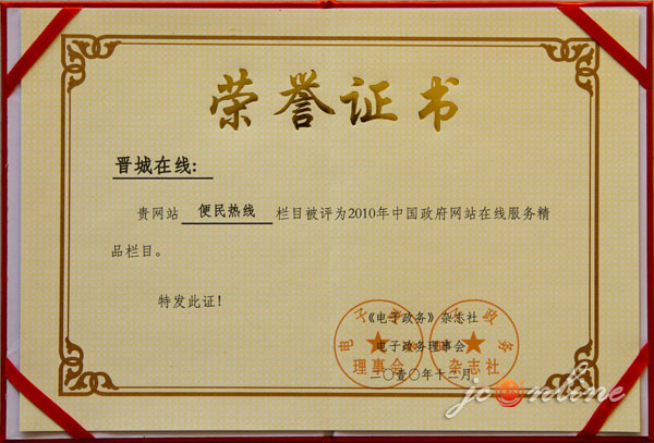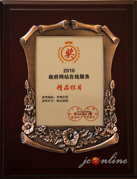 近年來,“晉城在線”已成為山西省內(nèi)外知名的信息站點,先后獲得了“中國城市門戶網(wǎng)站十大公信品牌”、“2008年中國政府門戶網(wǎng)站優(yōu)秀獎”、“2009年中國政府門戶網(wǎng)站優(yōu)秀獎”、“中國優(yōu)秀誠信品牌”、““2008年中國政府門戶網(wǎng)站信息公開領(lǐng)先獎”、“全國地方門戶網(wǎng)站十佳品牌”、“全國地方網(wǎng)站最具創(chuàng)新發(fā)展?jié)摿ζ放啤薄ⅰ?010年中國政府網(wǎng)站領(lǐng)先獎”等諸多榮譽稱號。